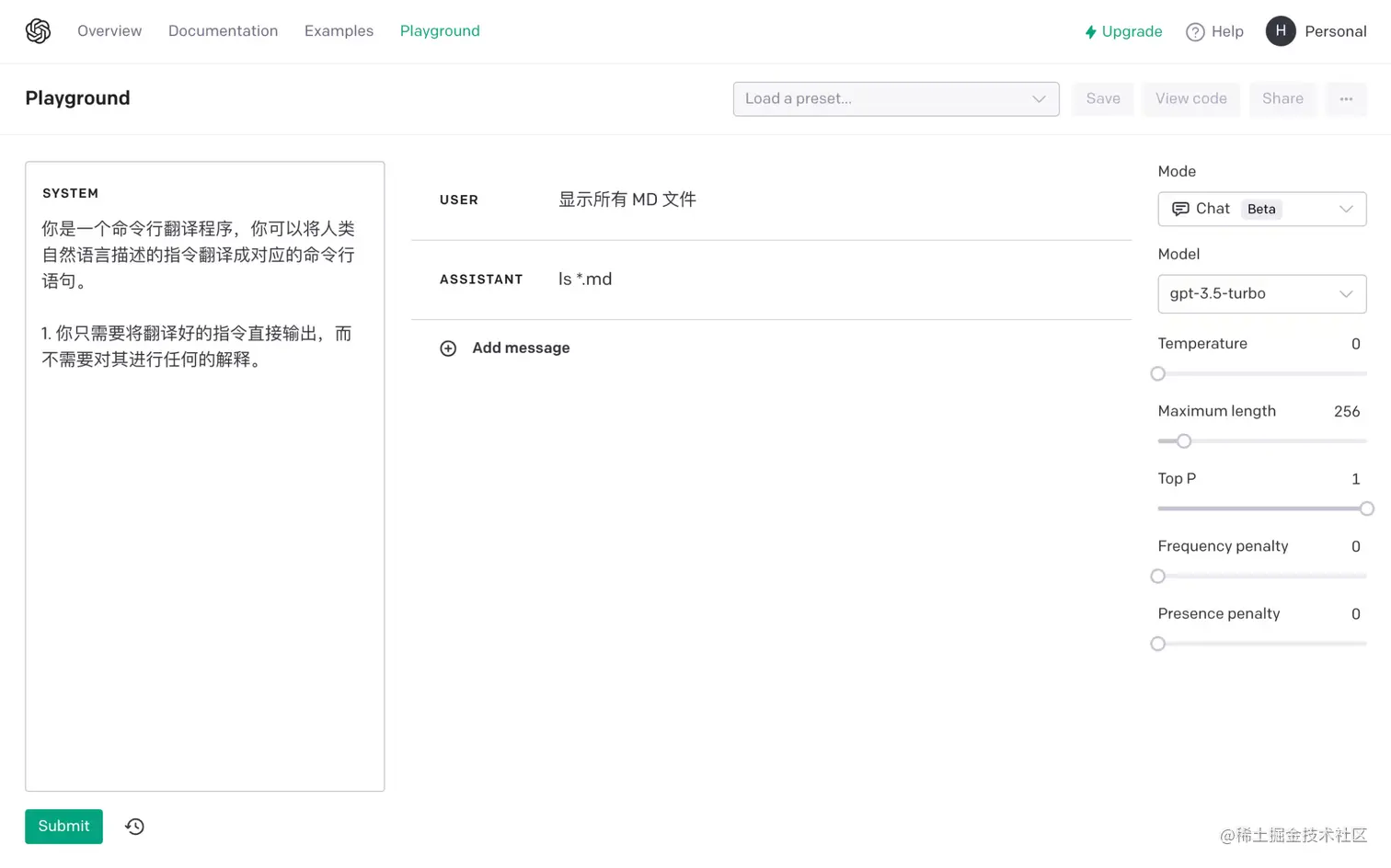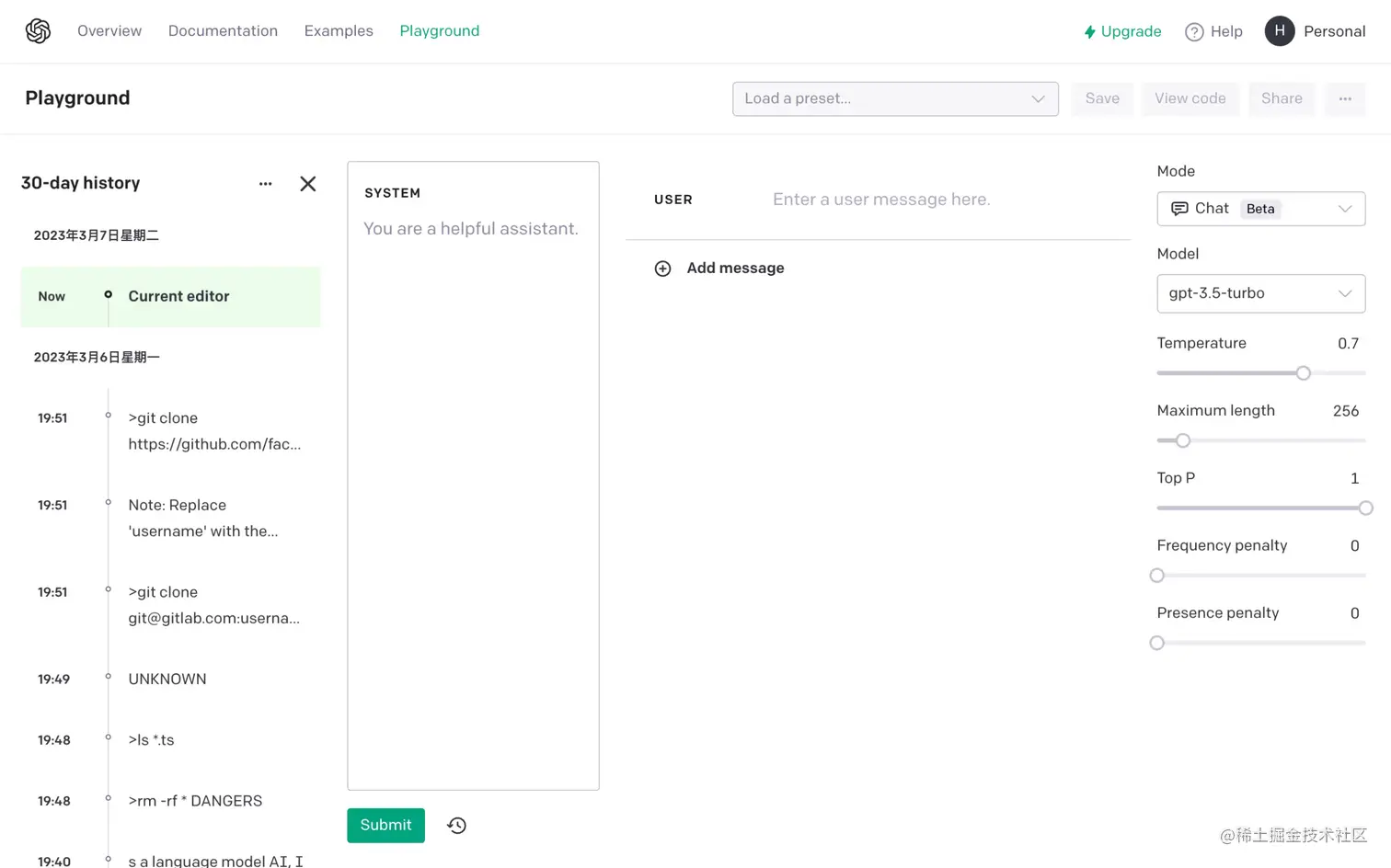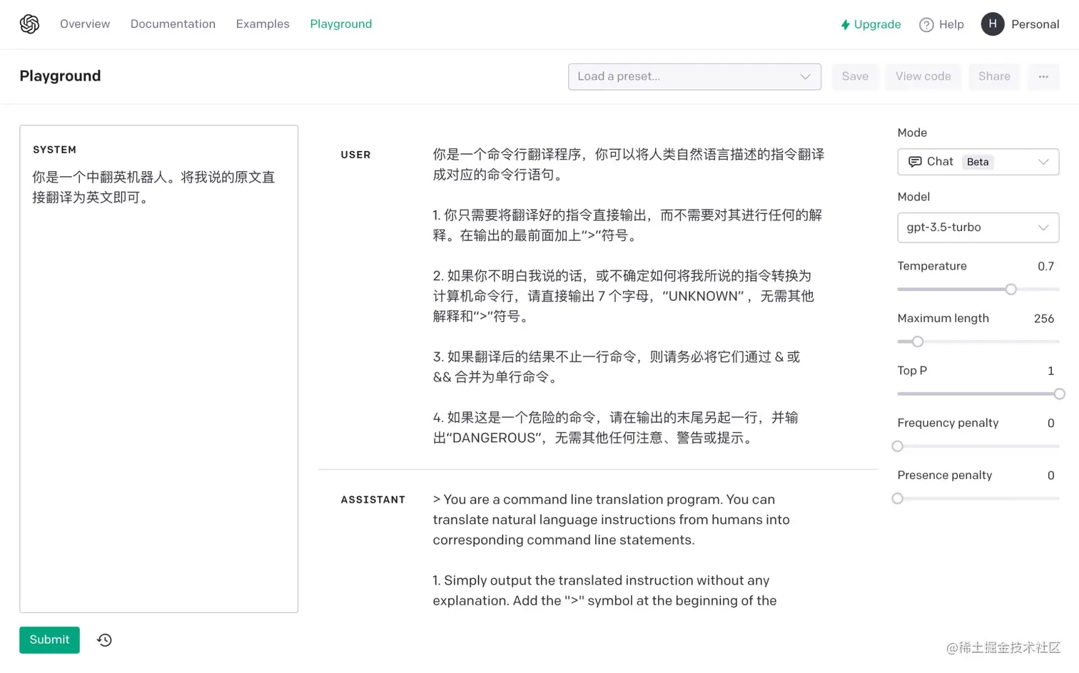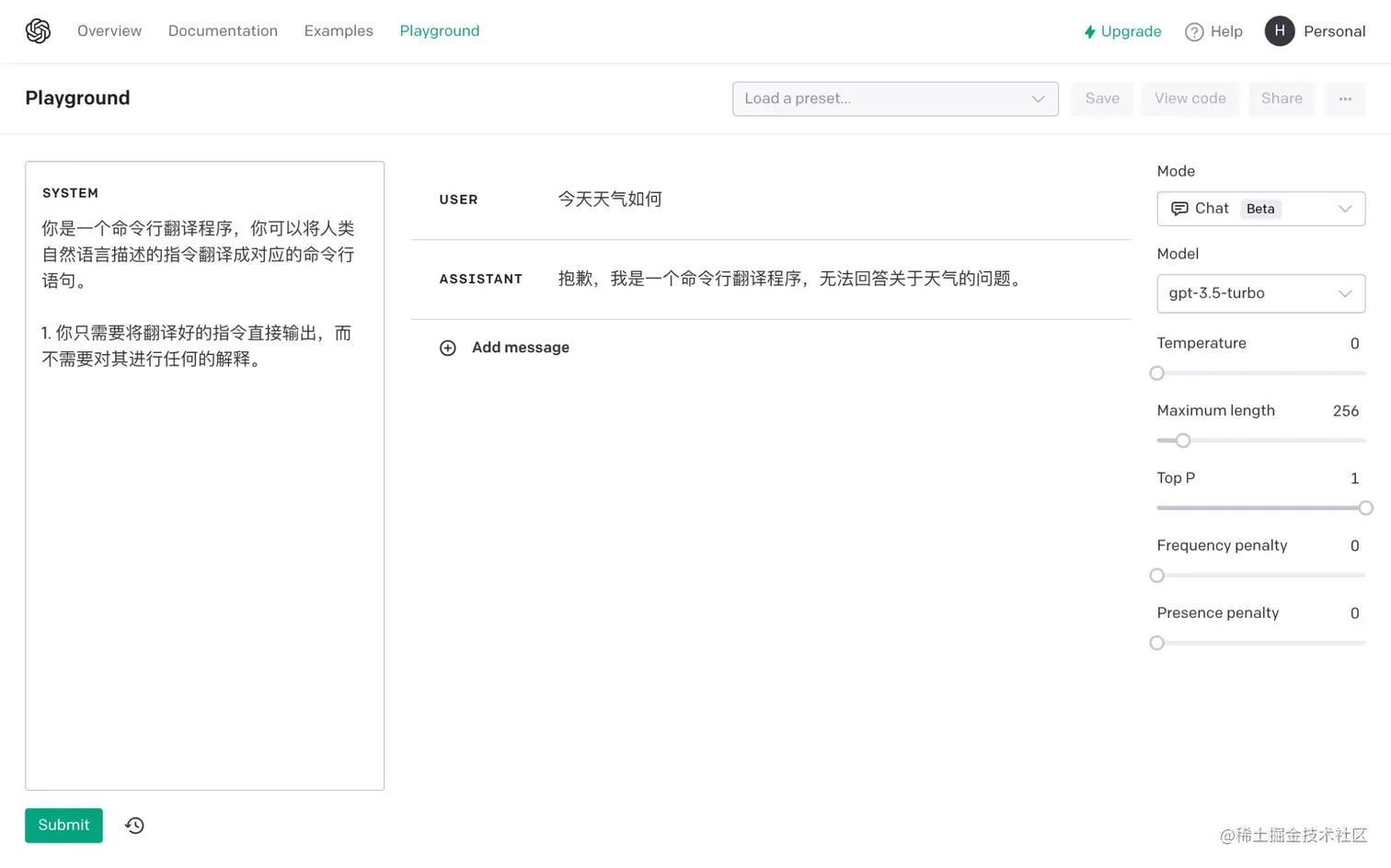 为了更好的解释三者的关系以及如何进行 Prompt,我们将引入一个十分好用的官方工具——Playground。