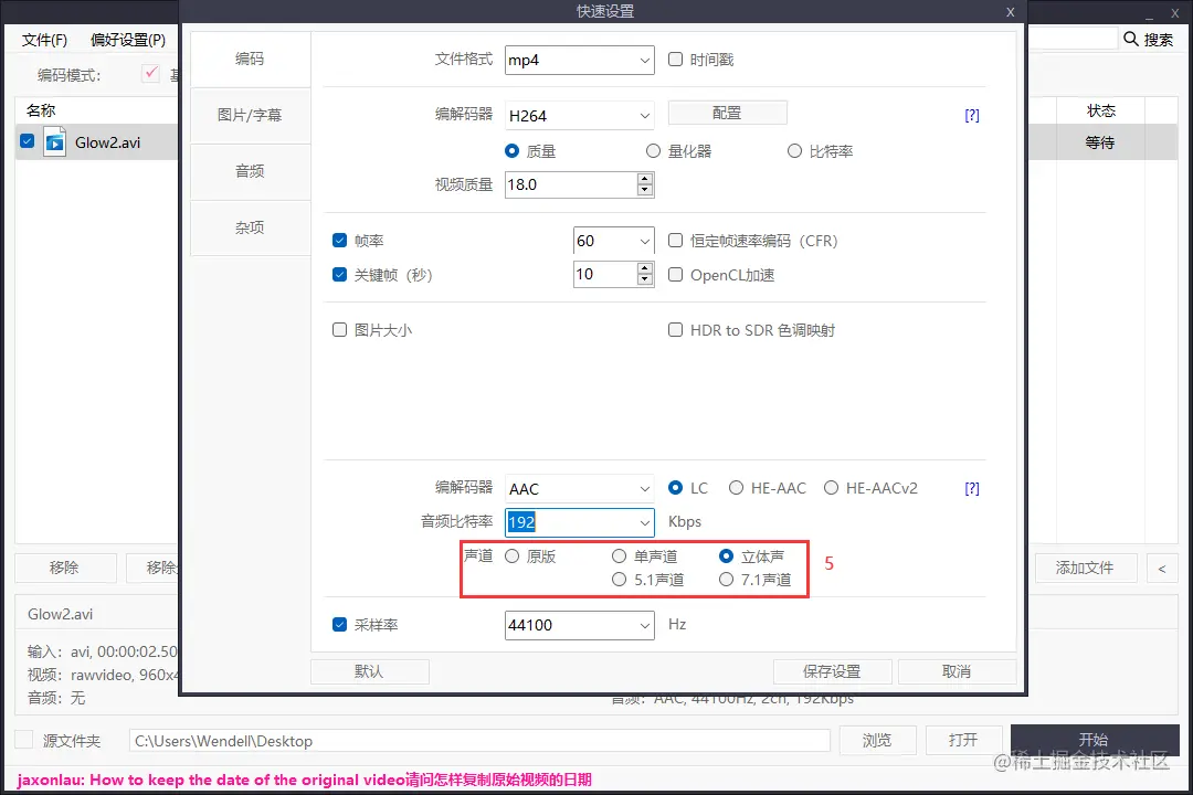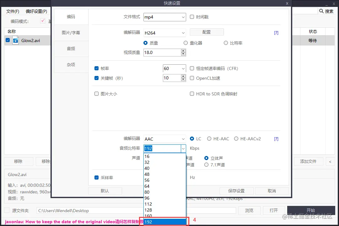 建议设置在64~192之间,越低的音频比特率,会使视频变小,但是音质也会怕应的降低,请酌情设置