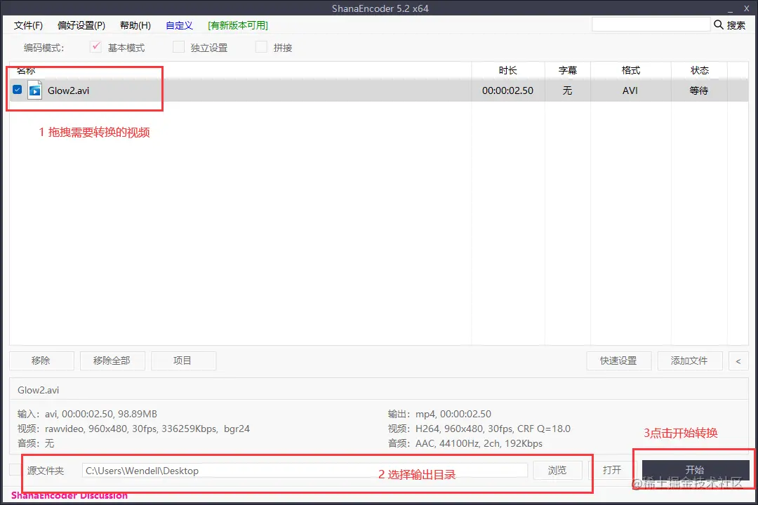 注意:需要拖拽第一步生成的AVI文件到ShanaEncoder软件中如果转换出的视频偏大,可以参考2.3进阶教程,进行参数设置,得到质量合适且大小合适的视频。