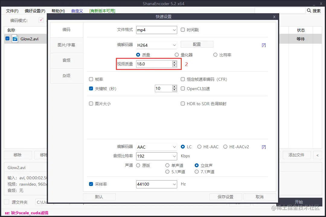 视频质量建议保持在18~23之间,18为高质量,23为一般质量,建议大家设置合适的质量,以便于得到合适的视频大小