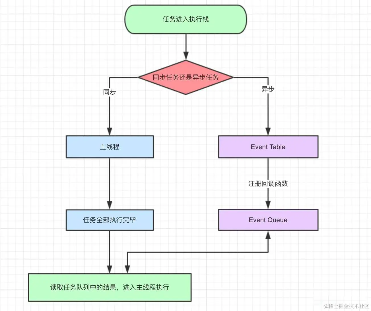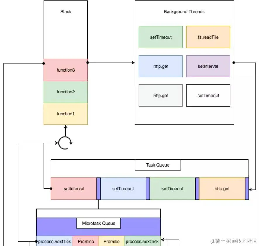 - 图中没有画UI rendering的节点,因为这个是由浏览器自行判断决定的,但是只要执行UI rendering,它的节点是在执行完所有的microtask之后,下一个macrotask之前,紧跟着执行UI render。