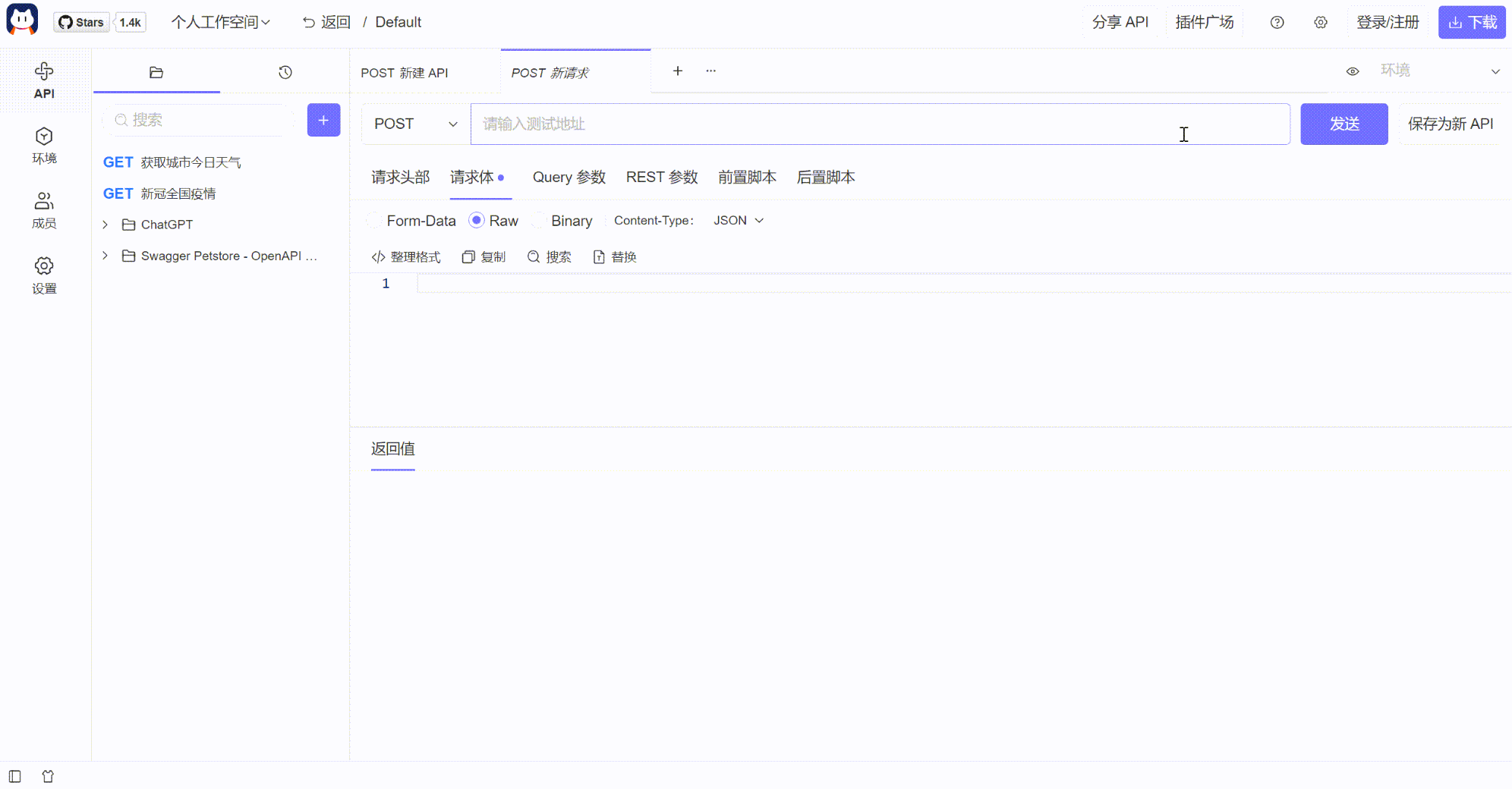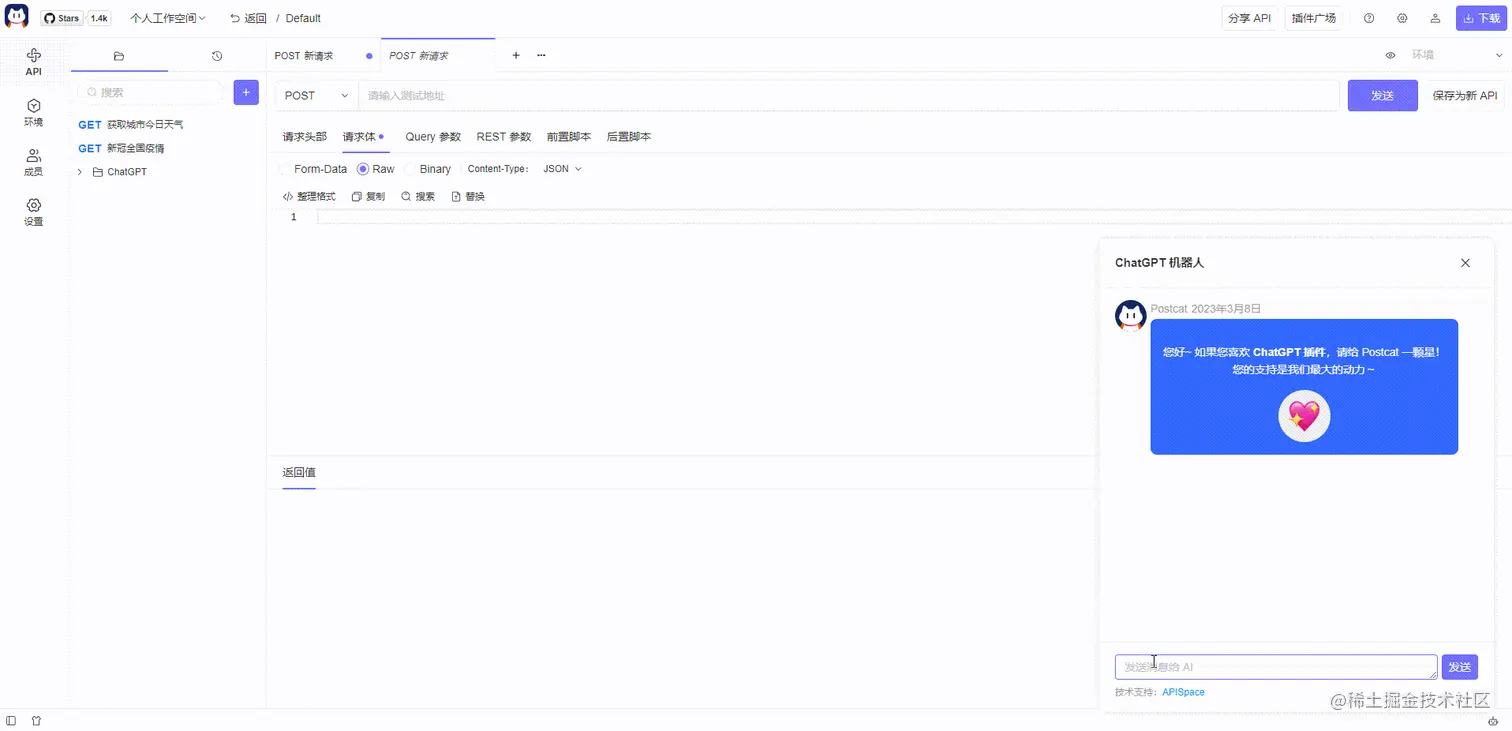 Postcat 是开源的 API 管理工具,有 API 相关的核心功能,还有丰富的插件广场,帮你快速地完成 API 的发布和测试功能。