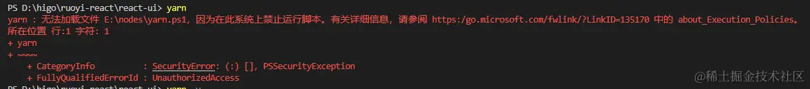 windows电脑下vscode中yarn命令报权限问题 Tumi 2023-04-04 73 阅读1分钟 执行如下命令: 1. get-ExecutionPolicy 运行结果:Restricted 2. Set-ExecutionPolicy -Scope CurrentUser 3. ExecutionPolicy: RemoteSigned 4. 查看yarn版本 yarn -v 5. 出现版本号即可