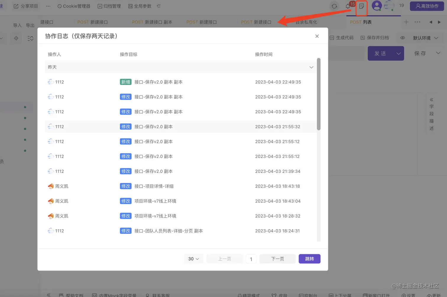 在多人在线协作时,如果处理不当,可能会存在数据不同步、数据保存冲突、变更记录无法追溯等问题。而Apipost支持多人在线协作,并且实现了数据实时同步和有冲突解决机制。此外,Apipost还提供协作日志功能,方便用户查询协作数据的变更记录。