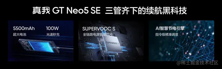 为了让年轻人告别续航困扰,真我GT Neo5 SE带来了一套软硬件结合的全链路式续航解决方案。百瓦闪充+大电池超级续航组合、电源管理芯片以及续航优化算法提升,三管齐下挑战行业最强续航。