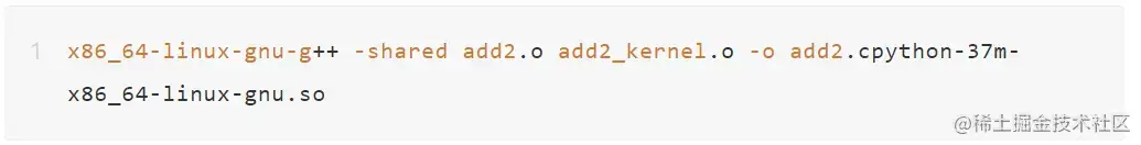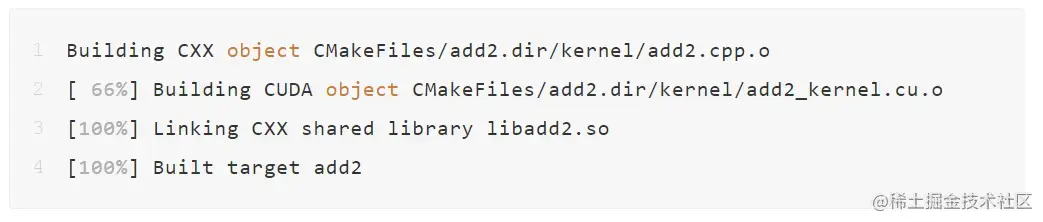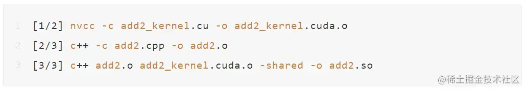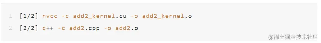 由于输出太长,我省略了多数的参数信息,并精简了指令。可以看出先是调用nvcc编译了.cu,生成了add2_kernel.cuda.o;然后调用c++编译add2.cpp,生成了add2.o;最后调用c++生成动态链接库add2.so。