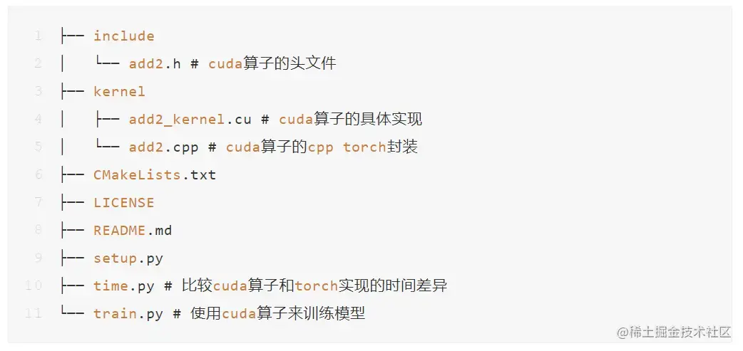 代码结构还是很清晰的。include文件夹用来放cuda算子的头文件(.h文件),里面是cuda算子的定义。kernel文件夹放cuda算子的具体实现(.cu文件)和cpp torch的接口封装(.cpp文件)。