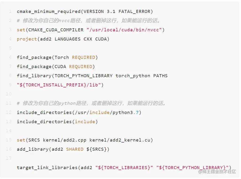 这里踩了好几个大坑。首先是找不到nvcc的路径,于是第3行先设置了一下,当然如果你删了也能跑那就更好。然后是找不到python的几个头文件,于是加上了第11行,同样如果你删了也能跑那就更好。最后是一个巨坑,没有链接TORCH_PYTHON_LIBRARY,导致动态链接库生成成功了,但是调用执行一直报错,所以加上了第8行和第17行。
