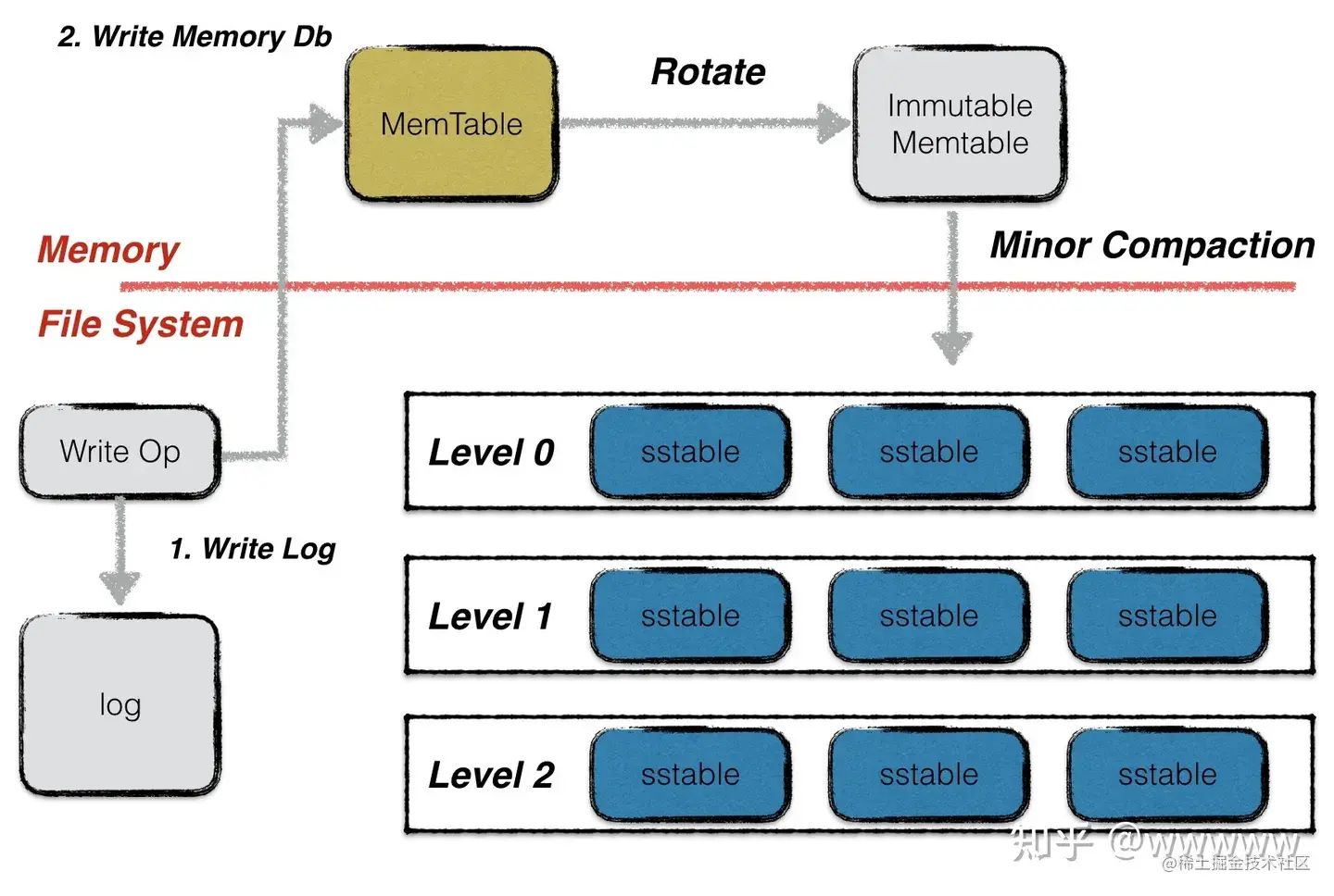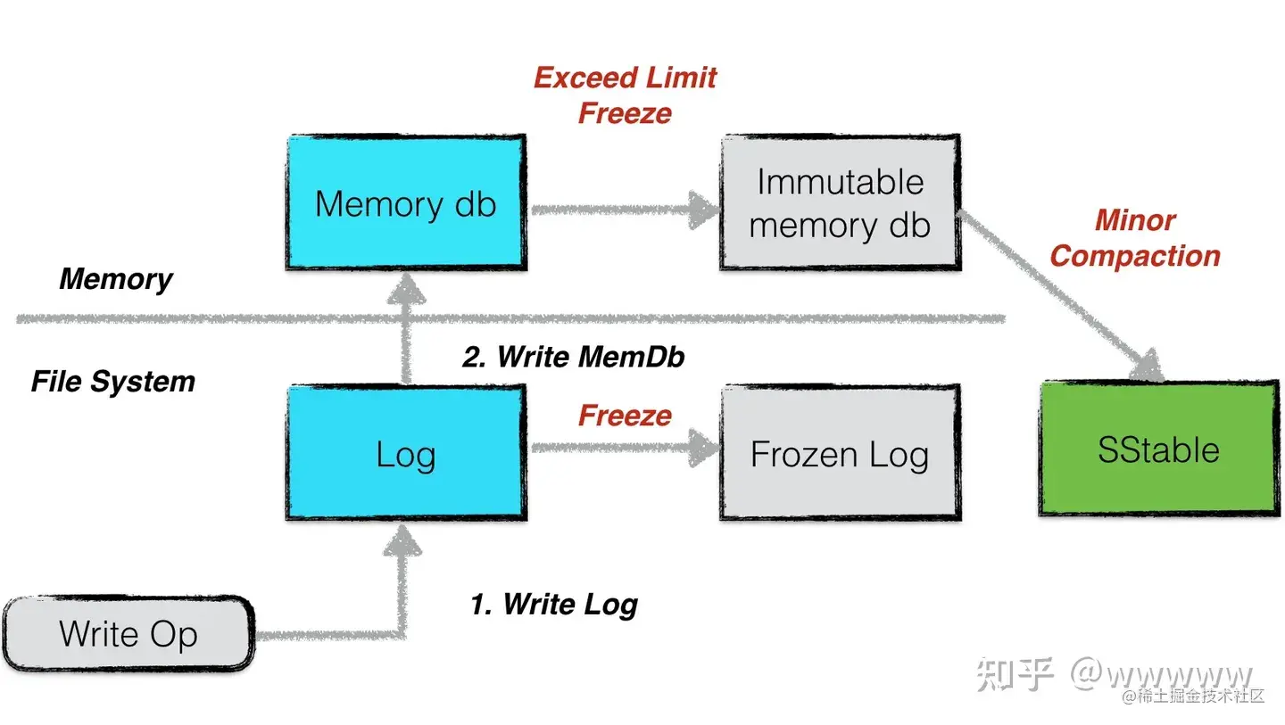Memory db写入到一定大小时,会被锁定,然后转变成SSTable,这个过程被称之为minor compaction