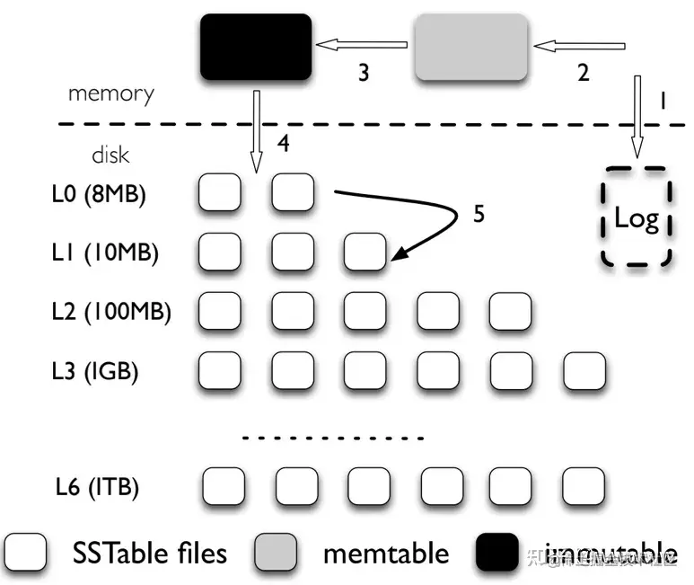 在LevelDB中,Li层级的SSTable跟Li+1层级进行合并时,需要先读取对应所有的SSTable文件,在内存中进行归并排序,然后生成新的SSTable,并全量写回硬盘。