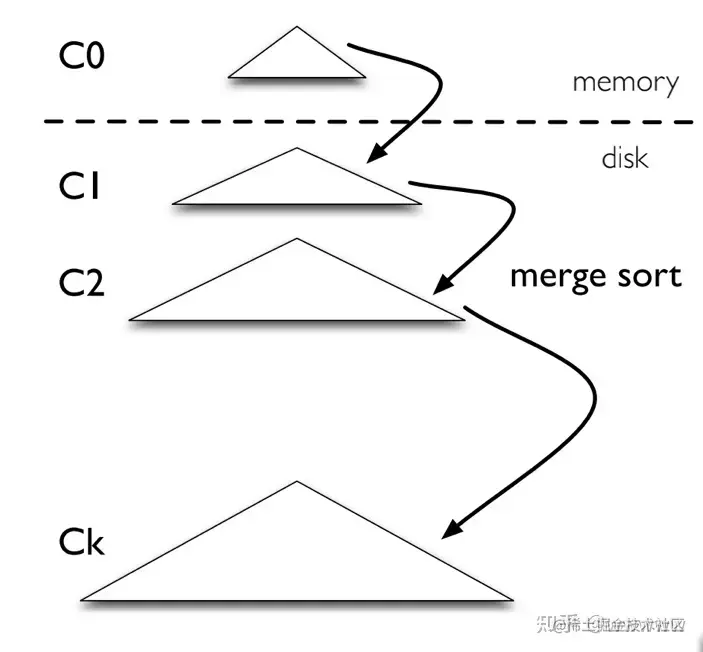 - 第三部,当C0的大小达到阈值时,它会跟硬盘上的C1进行归并排序操作,这个操作被称为compaction。两者合并生成的新文件会被顺序写入硬盘,取代旧版本的C1。