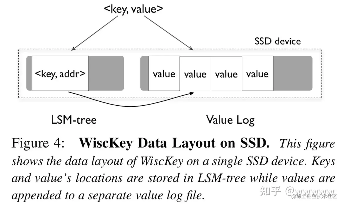 WiscKey将键值分开存储,lsm-trees只存键和索引,值存在单独value log里面。