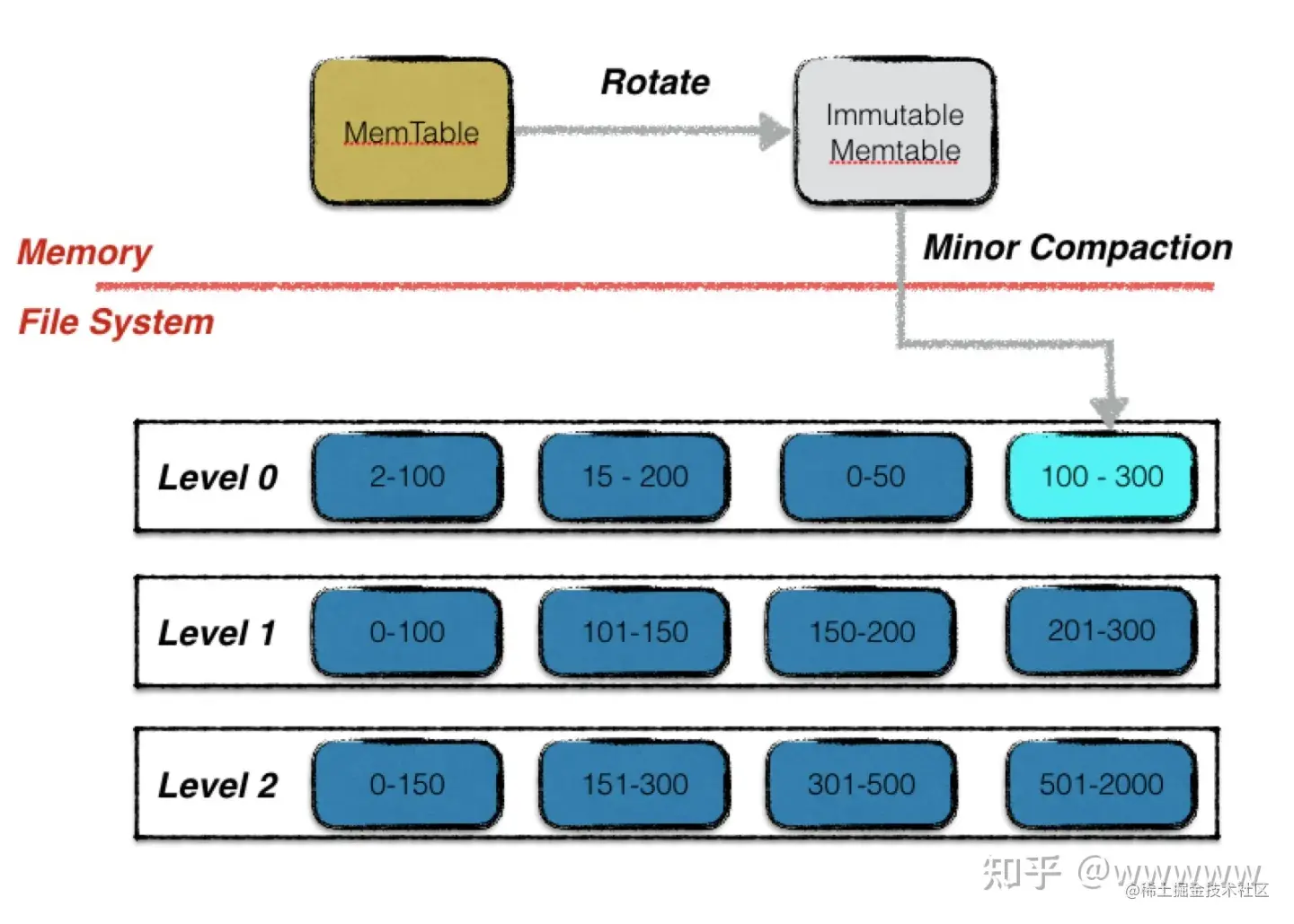 - 第一,为了寻找一对键值对,LevelDB需要查询多个SSTable文件。最差情况下,LevelDB需要查询4个L0层级SSTable,以及L1到L6每层一个文件,共10个文件。