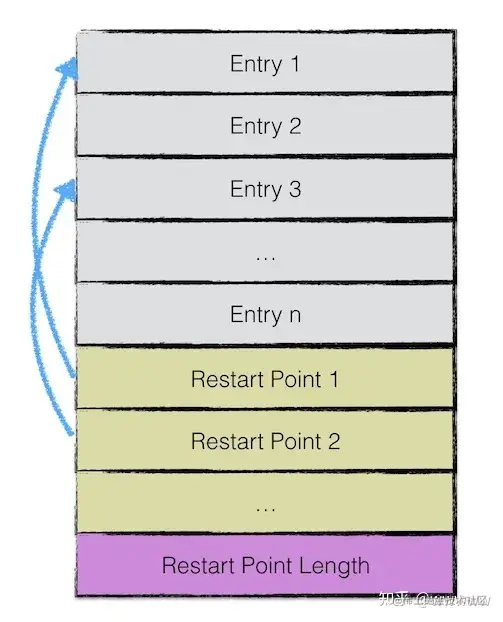 每间隔若干个keyvalue对,将为该条记录重新存储一个完整的key。重复该过程(默认间隔值为16),每个重新存储完整key的点称之为Restart point。