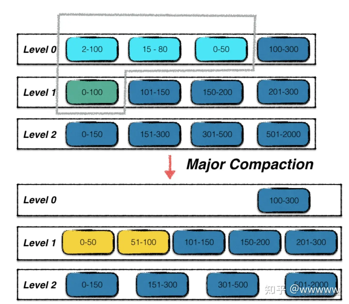 之后在合并的过程中将这些sub-level中的数据进行合并,并将合并后的内容作为下一个level。