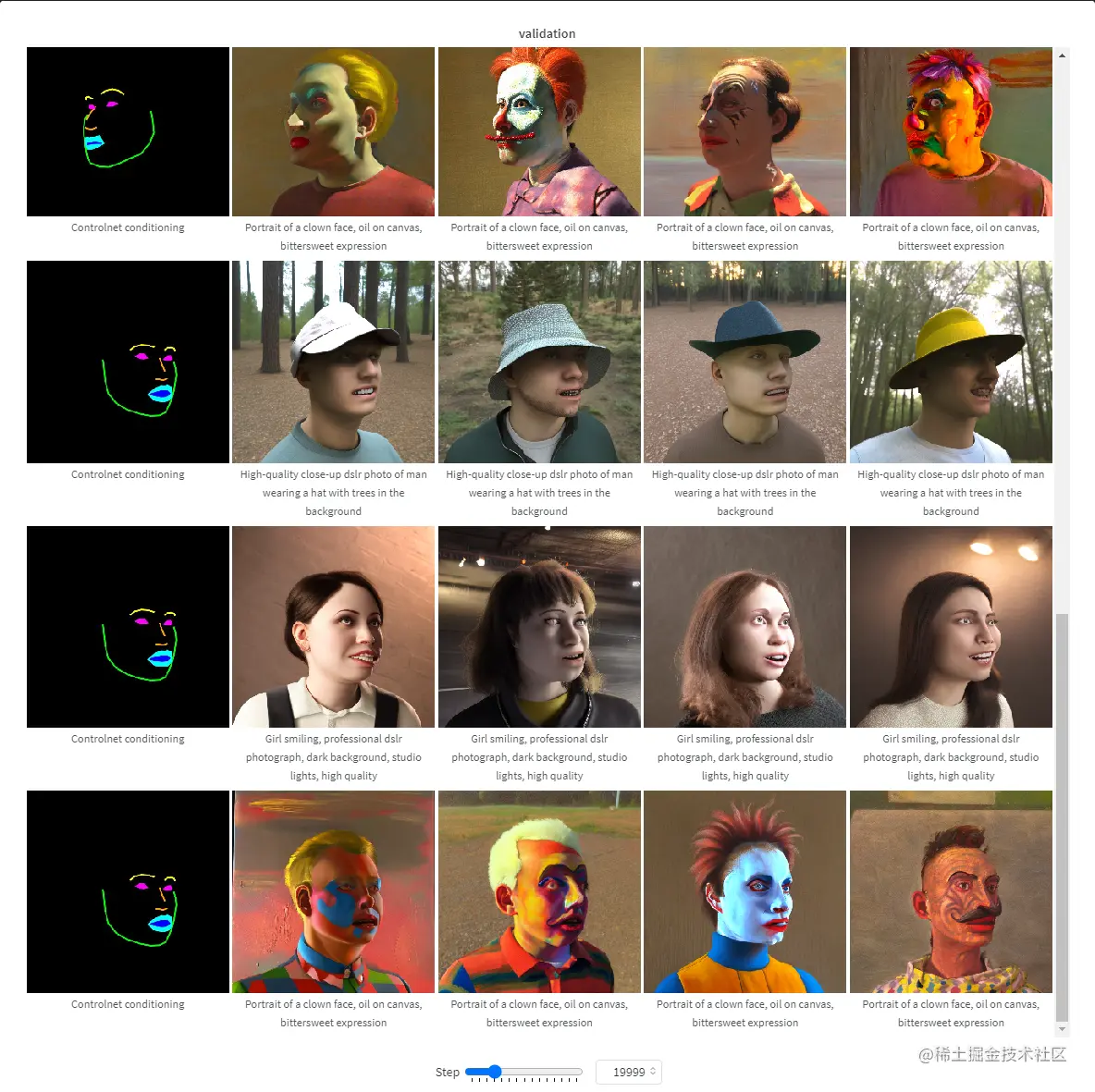 pretrained_model_name_or_path: 基础的 Stable Diffusion 模型,这里我们使用 v2-1 版本,因为这一版生成人脸效果更好output_dir: 保存模型的目录文件夹dataset_name: 用于训练的数据集,这里我们使用 Face Synthetics SPIGA with captionsconditioning_image_column: 数据集中包含条件图片的这一栏的名称,这里我们用spiga_segimage_column: 数据集中包含 ground truth 图片的这一栏的名称,这里我们用imagecaption_column: 数据集中包含文字说明的这一栏的名称,这里我们用image_captionresolution: ground truth 图片和条件图片的分辨率,这里我们用512x512learning_rate: 学习率。我们发现设成1e-5效果很好,但你也可以试试介于1e-4和2e-6之间的其它值validation_image: 这里是让你在训练过程中偷窥一下效果的。每隔validation_steps步训练,这些验证图片都会跑一下,让你看看当前的训练效果。请在这里插入一个指向一系列条件图片的本地路径validation_prompt: 这里是一句文本提示,用于和你的验证图片一起验证当前模型。你可以根据你的需要设置train_batch_size: 这是训练时使用的 batch size。因为我们用的是 V100,所以我们还有能力把它设成 4。但如果你的 GPU 显存比较小,我们推荐直接设成 1。num_train_epochs: 训练模型使用的轮数。每一轮模型都会看一遍整个数据集。我们实验用的是 3 轮,但似乎最好的结果应该是出现在一轮多一点的地方。当训练了 3 轮时,我们的模型过拟合了。checkpointing_steps: 每隔这么多步,我们都会保存一下模型的中间结果检查点。这里我们设置成 5000,也就是每训练 5000 步就保存一下检查点。validation_steps: 每隔这么多步,validation_image和validation_prompt就会跑一下,来验证训练过程。report_to: 向哪里报告训练情况。这里我们使用 Weights and Biases 这个平台,它可以给出美观的训练报告。push_to_hub: 将最终结果推到 Hugging Face Hub.