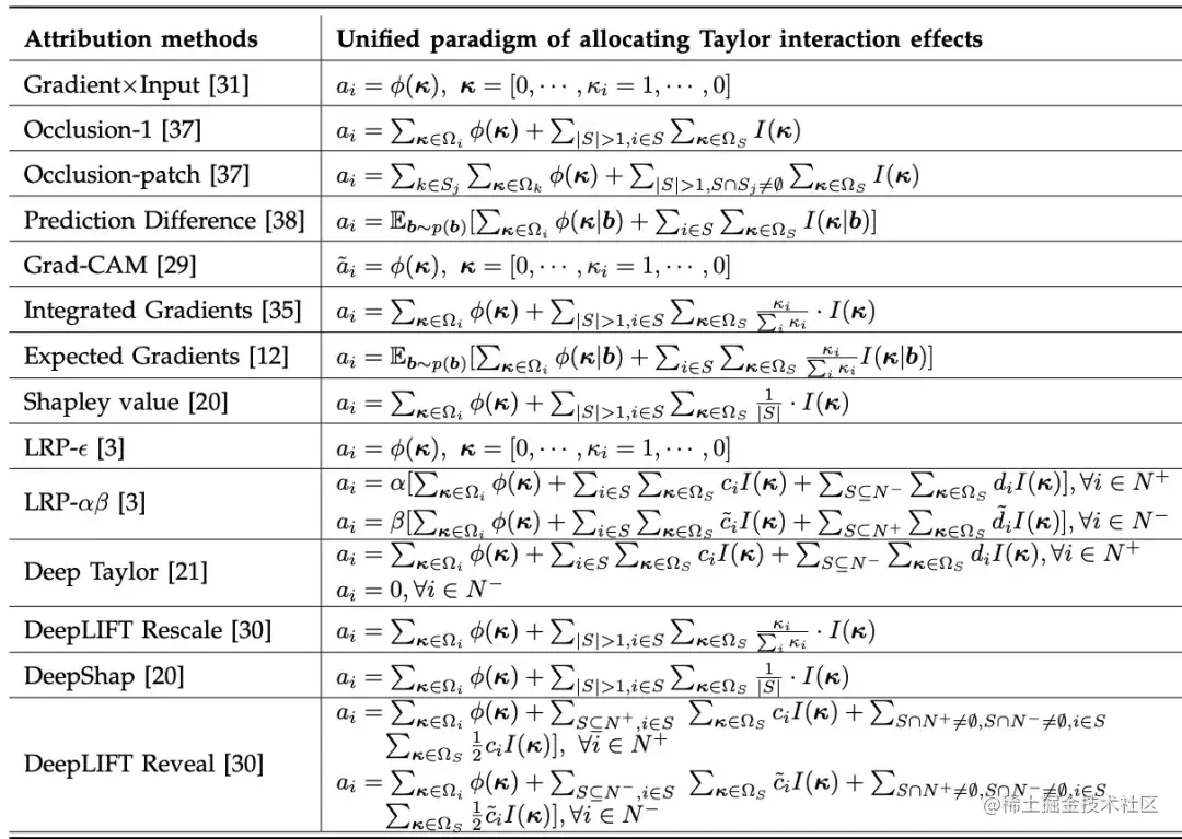 - 第一,在众多经验性归因算法充斥可解释机器学习领域的环境下,我们希望证明 “所有 14 种归因算法(解释神经网络输入单元重要性的算法)的内在机理,都可以表示为对神经网络所建模的交互效用的一种分配,不同归因算法对应不同的交互效用分配比例”。这样,虽然不同算法有着完全不同的设计着眼点(比如有些算法有提纲挈领的目标函数,有些算法则是纯粹的 pipeline),但是我们发现在数学上,这些算法都可以被我们纳入到 “对交互效用的分配” 的叙事逻辑中来。