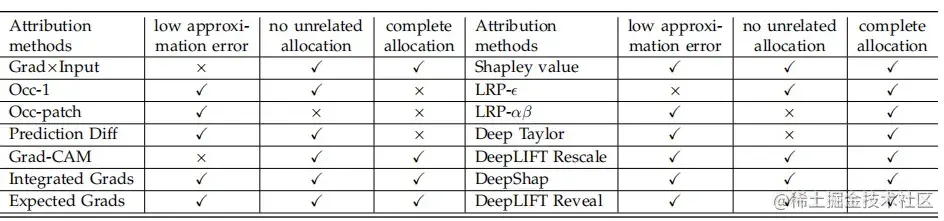 表 2. 总结 14 种不同归因算法是否满足三条可靠性评估准则