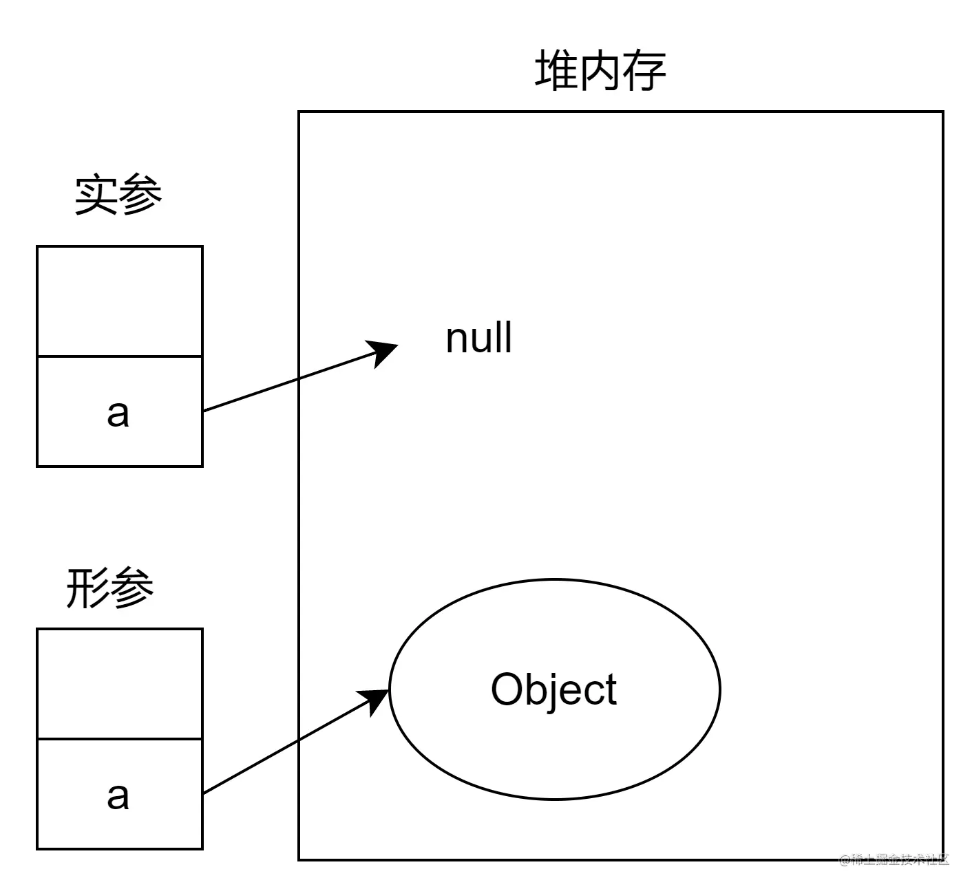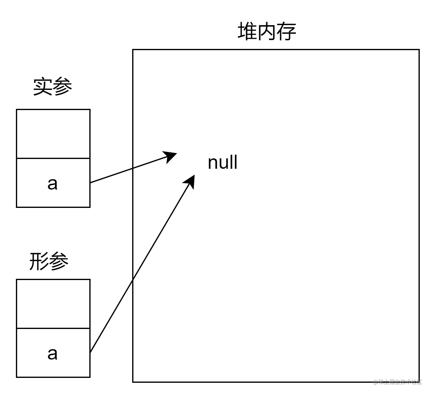 如图所示,执行函数时,实参a的值复制给实参a,此时形参和实参a都指向null。