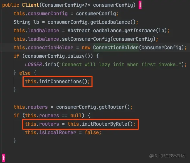 4、在client中,先定义其负载均衡,然后判断是否需延迟建立长链接。否的话,会直接进行初始化连接。其次如果未定义路由规则,或者不存在连接时,Client会先初始化相关的路由以及初始化连接,如下: