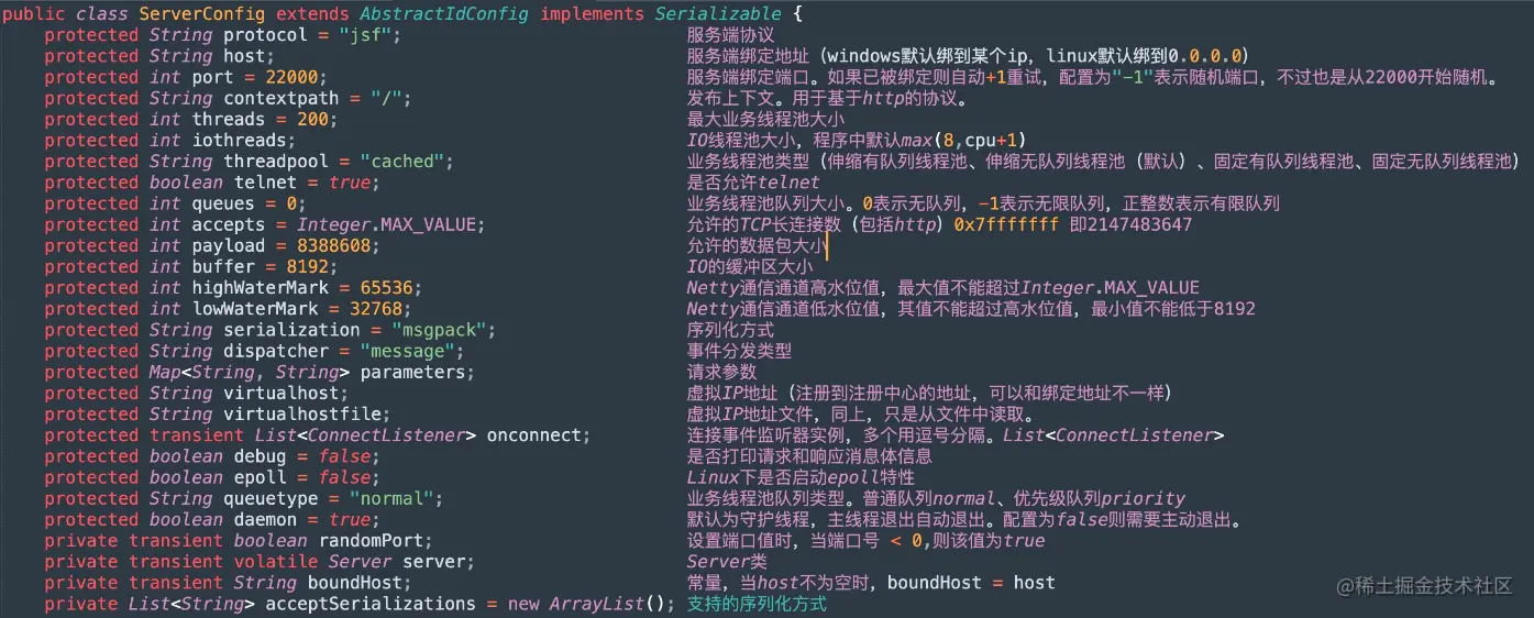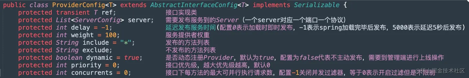 4、最终这些配置(也就是我们在xml中配置的标签值)会解析成为ServerConfig和ProviderConfig,并且会依据所配置的属性,对相应的类进行属性的赋值。
