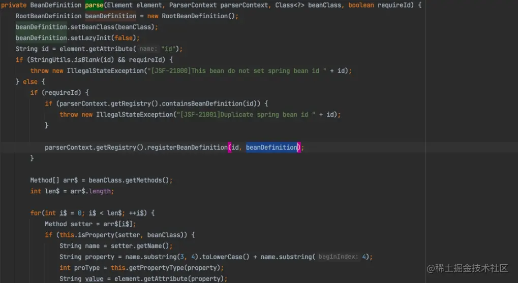 OK,我们回到JSFNamespaceHandler看一下服务是如何暴露的。众所周知,在Spring容器中的bean一定会经历一个初始化的过程。所以通过com.jd.jsf.gd.config.spring.JSFBeanDefinitionParser实现org.springframework.beans.factory.xml.BeanDefinitionParser来进行xml的解析,另外通过ParserContext中封装了BeanDefinitionRegistry对象,用于BeanDefinition的注册,用来初始化各个bean,即(com.jd.jsf.gd.config.spring.JSFBeanDefinitionParser#parse)。