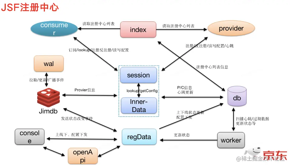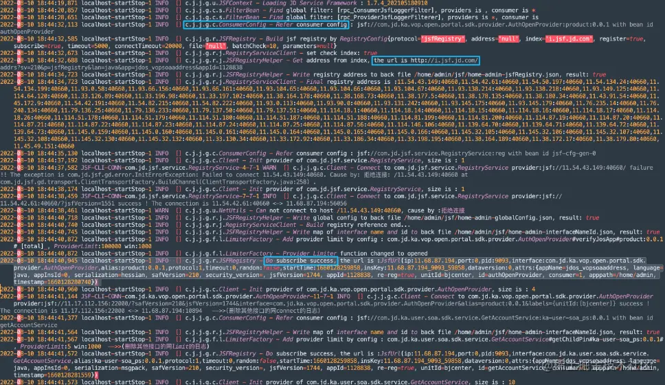 第一部分:Provider端启动服务向注册中心Session注册自己的服务,注册服务的形式如:[jsf://192.168.124.73:22000/?safVersion=210&jsfVersion=1691&interface=com.jd.wxt.material.service.DspTaskQueueService&alias=chengzhi36_42459] 此时在注册服务,暴露服务的过程中,此时JsfRegistry会进行初始化连接。在此过程中,如果有配置对应的Server端,那么还会对Server进行初始化.