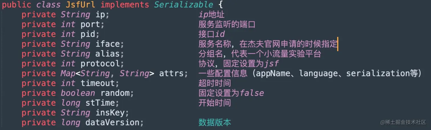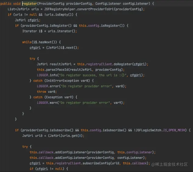 6、服务注册(com.jd.jsf.gd.registry.JSFRegistry#register)的过程会将对应的ProviderConfig转换为JsfUrl类,这里JsfUrl是整个框架的核心,他保存了一系列的配置,并且和其同样重要的还有订阅Url类SubscribeUrl,这里JsfUrl属于服务Url,服务Url中保存了协议,端口号,ip地址等相关重要的信息,并且回到上层JsfContext会将配置信息维护起来(JSFContext.cacheProviderConfig(this);)。到这里(this.exported = true;)provider的服务从配置装配到服务暴露就完成了。