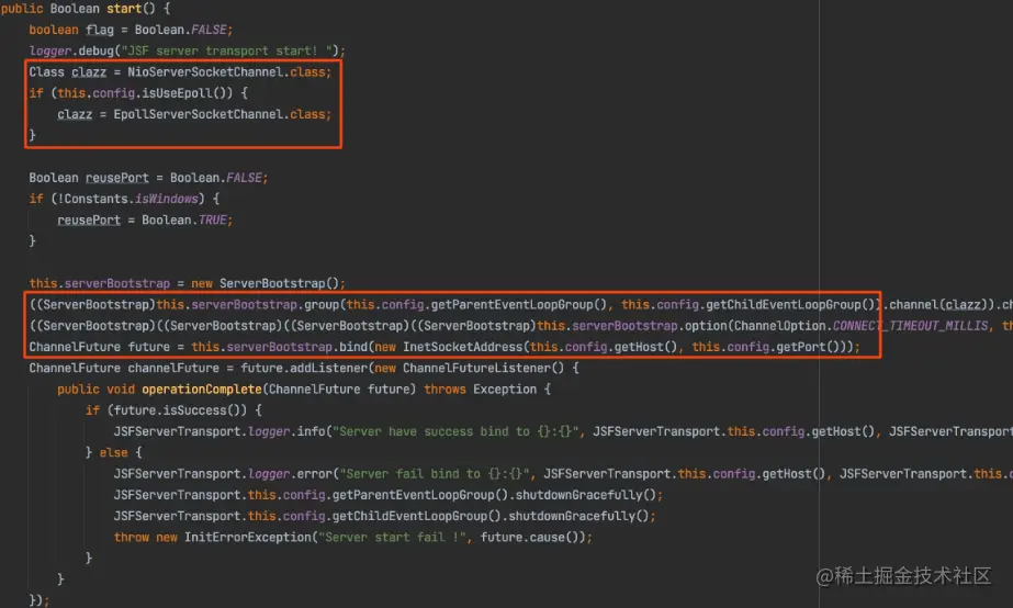 4、start方法中会调用ServerFactory中的方法产生相对应的对象,然后会调用Server中的方法去启动Server,而在这个过程中,最终会对应到ServerTransportFactory产生相应的传输层,即是定位到JSFServerTransport的start()方法,在这里我们可以看到,该部分实现了netty框架的transport层,在进入这个方法的时候,会根据是否配置使用epoll模型来选择所生成的对象是EpollServerSocketChannel或者NioServerSocketChannel,然后在ServerBootStrap中初始化相关的参数,直到最后绑定好端口号。