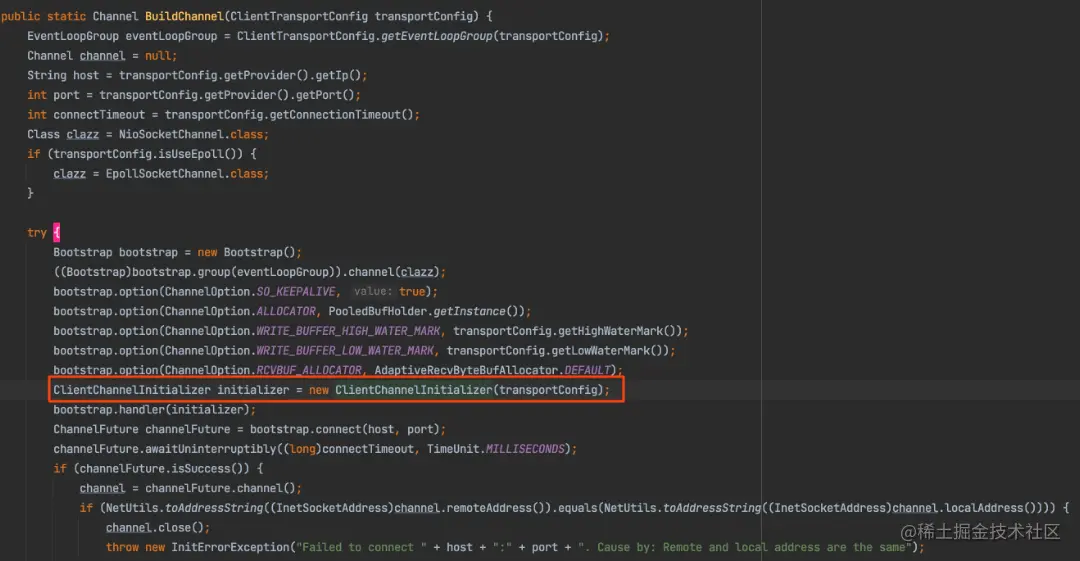 2)然后BuildChannel建立连接(com.jd.jsf.gd.transport.ClientTransportFactory#BuildChannel),在这里会对应到Server端启动代码的相关参数,即是该处会监听服务器端的端口号,绑定到相应的ip,并根据对应的通道做数据传输。