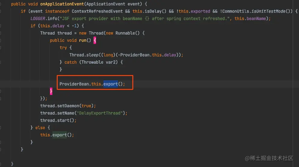 如下:bean类ProviderBean会监听上下文事件,并且当整个容器初始化完毕之后会调用export()方法进行服务的暴露。