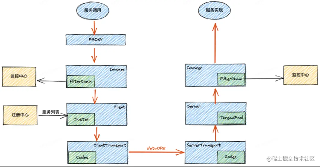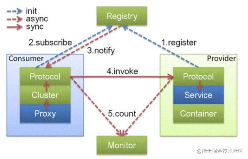总的来说,其提供者Provider,消费者Consumer,注册Registry等关系应该如下图所示: