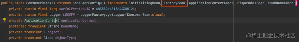 不过我们发现其实现了FactoryBean,如我们所了解的,如果一个 bean 实现了该接口(FactoryBean),它被用作一个对象的工厂来暴露,而不是直接作为一个将自己暴露的 bean 实例。这也就意味着需要调用getObject()来获取真正的实例化对象(可能是共享的或独立的)。之所以这样使用的原因在于我们的Consumer端只能调用接口,接口是无法直接使用的,它需要被动态代理封装,产生代理对象,再把它放入Spring容器中。因此使用FactoryBean其实只是为了方便创建代理对象而已。