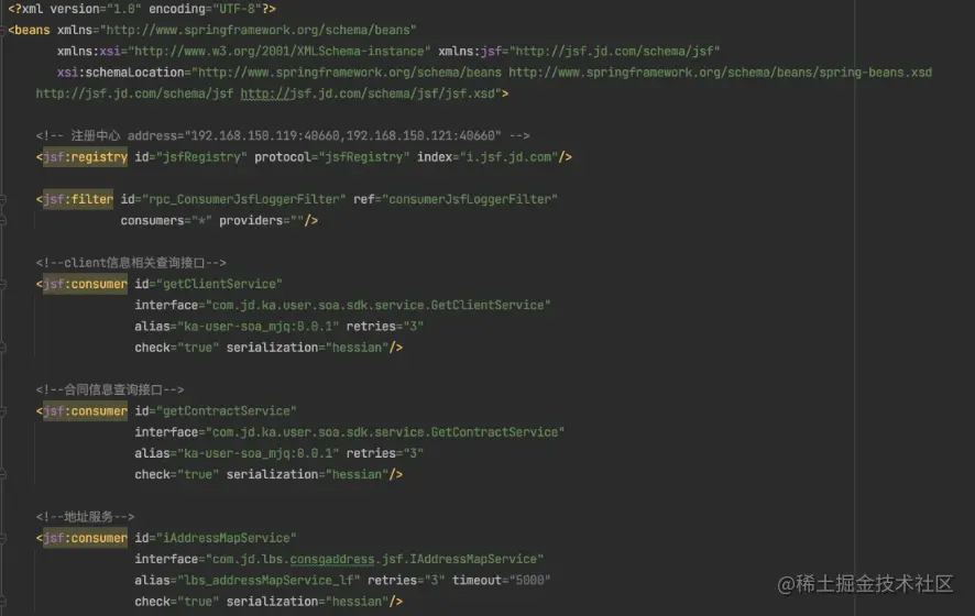 我们在上方的配置文件中发现到了注册中心地址i.jsf.jd.com,也就是说服务注册相关的配置没有写到jsf-provider.xml端,只是配置到了jsf-consumer.xml中而已。