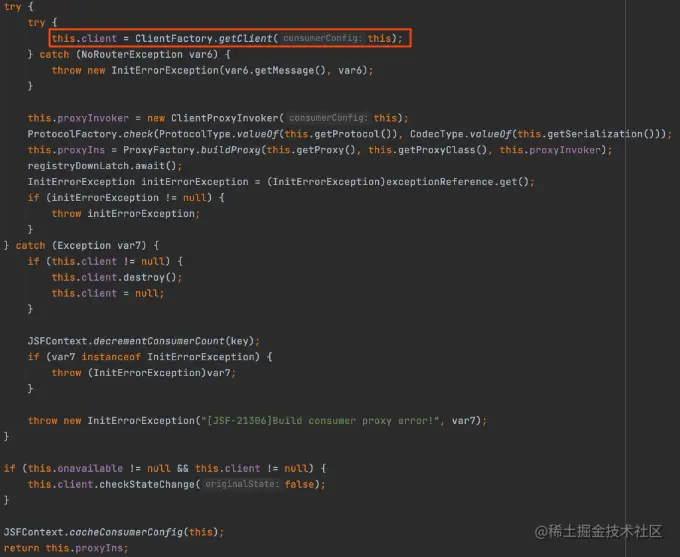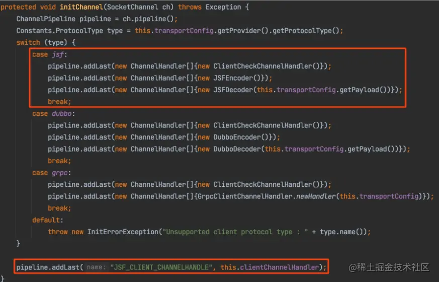 3)并且,对于transport层,我们应该关注他注入了哪些pipeline:可以看到JSFEncoder/JSFDecoder用来解码,编码具体的协议。handler则是具体的channel处理器,用于处理心跳包,客户端请求,和消息路由。最后回到最上层(com.jd.jsf.gd.config.ConsumerConfig#refer)将配置文件维护起来(JSFContext.cacheConsumerConfig(this);)。