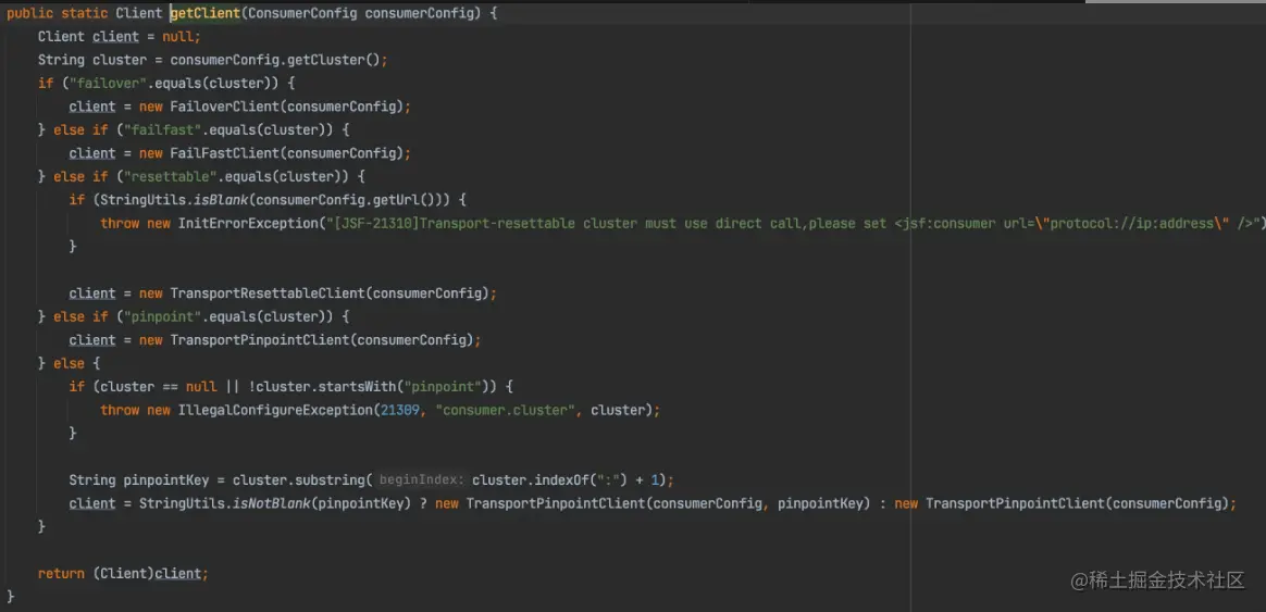 3、通过工厂模式生成一个Client的实例,由于上面ConsumerConfig->AbstractConsumerConfig默认的集群策略failover,所以在没有配置的情况下会生成FailoverClient,然后进行相关的Invoke操作(this.proxyInvoker = new ClientProxyInvoker(this);)。