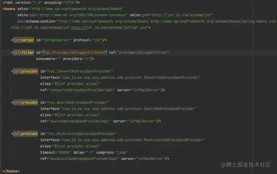 以我们地址服务的jsf-provider.xml文件为例,即: