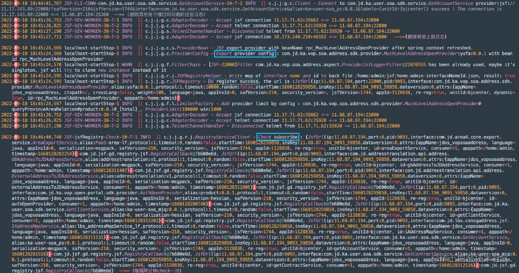 综上简单的过了一遍各自功能的初始化加载方式等简单阐述了一下,不过阅读起来肯定是偏零散的,需要我们根据以上步骤和源码包进行进一步探索。另外我们也可以用服务器启动日志上,看到JSF核心流程的日志记录,部分截图如下(感兴趣可以在预发机器的启动日志中翻阅):