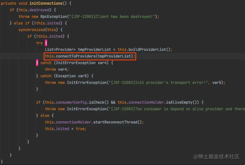 6、我们看到在获取连接过程(connectToProviders())中,如果连接池中已经存在则直接返回,不存在则需要重新建立连接。如下:会初始化一个名为JSF-CLI-CONN-#interfaceId的线程池,在线程池中会执行对应任务,即获取到一个ClientTransport对象。