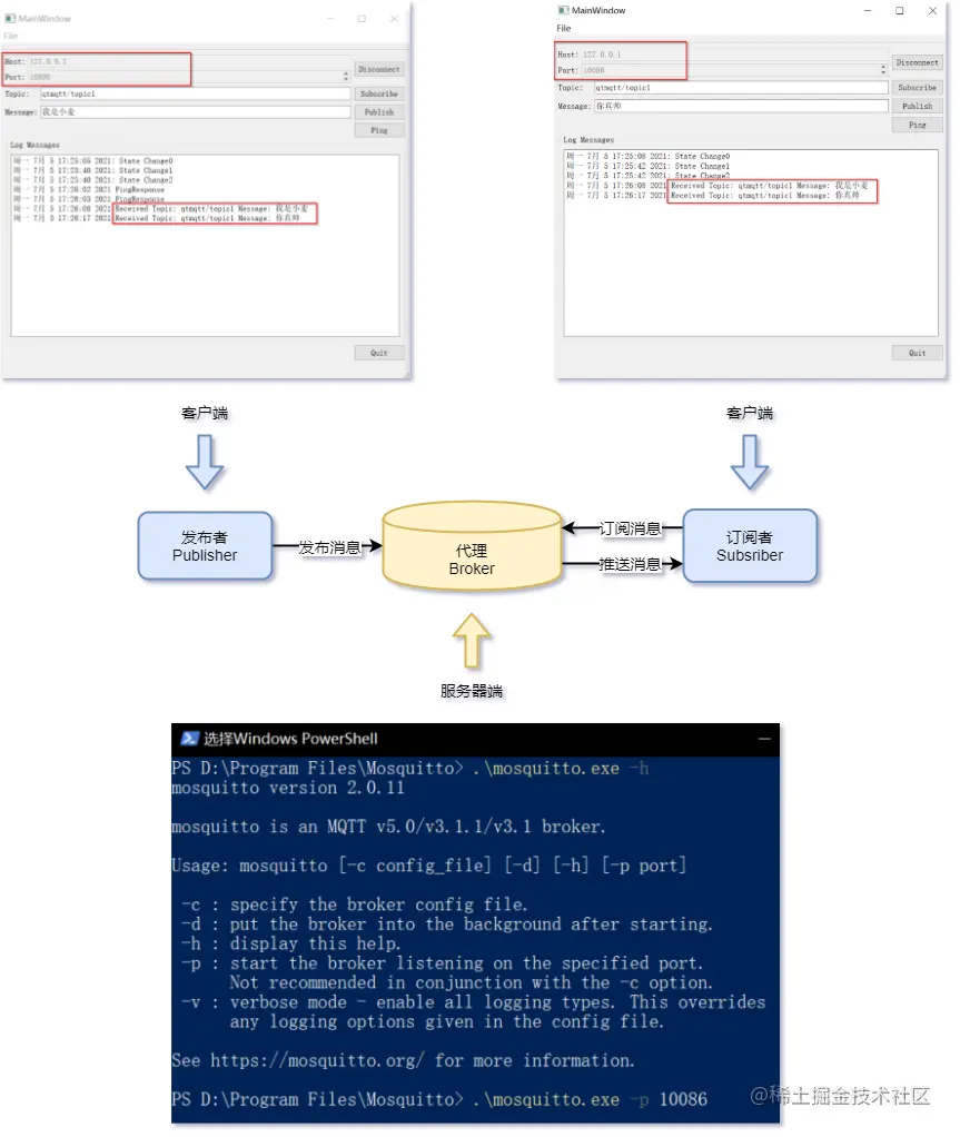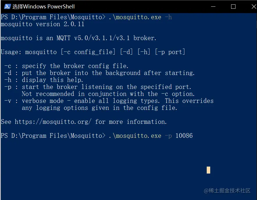 ./mosquitto.exe -p 10086,就开启了MQTT服务,监听的地址是127.0.0.1,端口是10086;