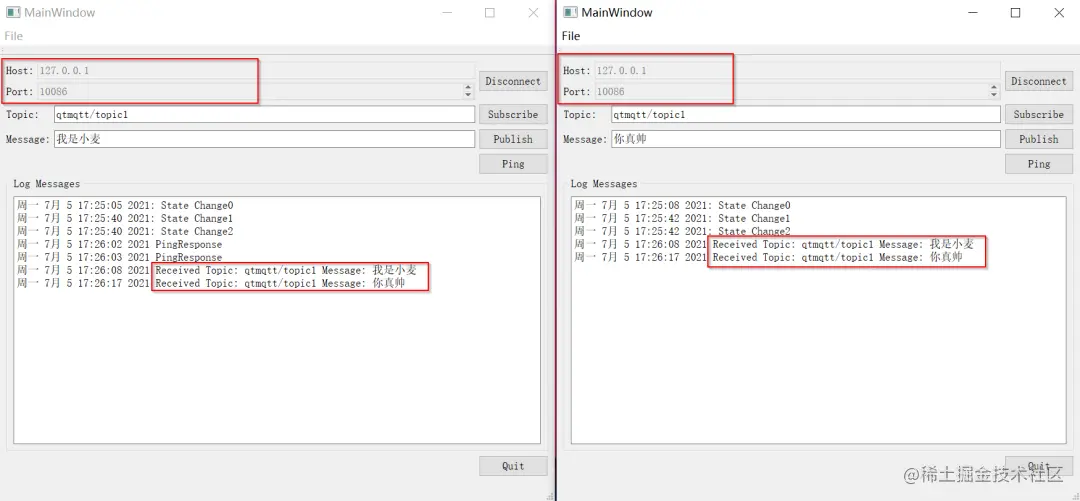 然后订阅主题,就可以互相发送数据了,具体如下图所示;