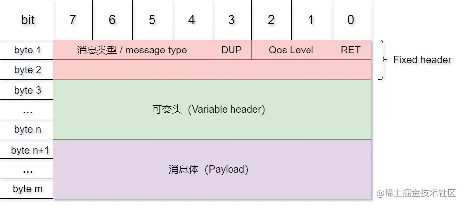 固定头(Fixed header),存在于所有MQTT数据包中,表示数据包类型及数据包的分组类标识;可变头(Variable header),存在于部分MQTT数据包中,数据包类型决定了可变头是否存在及其具体内容;消息体(Payload),存在于部分MQTT数据包中,表示客户端收到的具体内容;