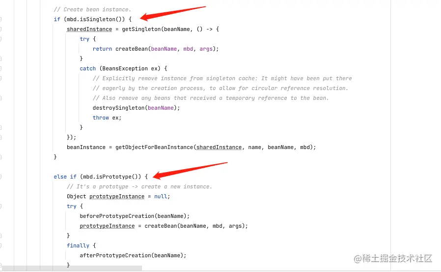 下图有两个判断,判断单例bean和多例bean,单例bean会创建bean后然后加入到singletonObjects中,多例bean则直接返回,他们的创建都是走同一个方法,同一样的流程。