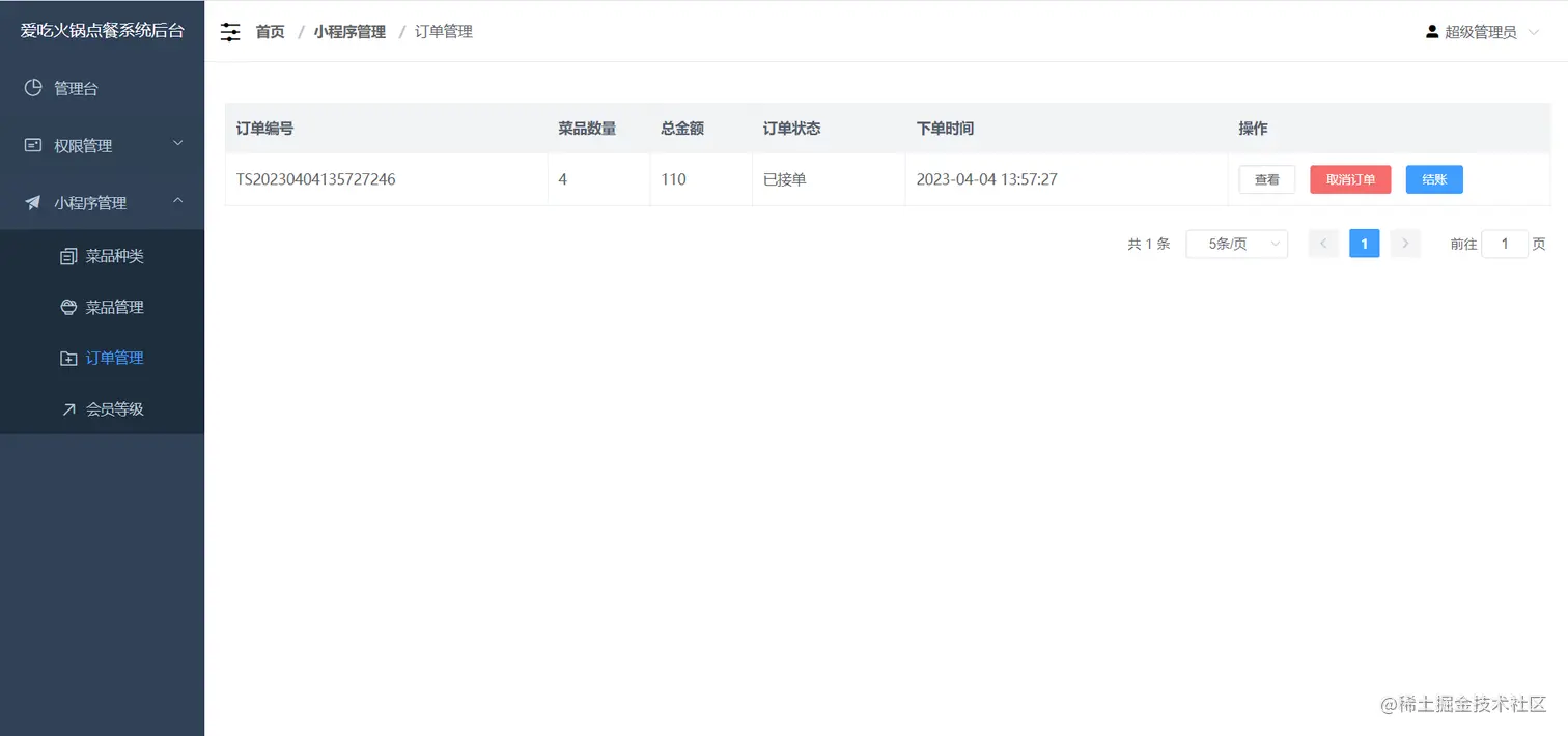 小程序管理:包含菜品种类、菜品管理、订单管理、会员等级。