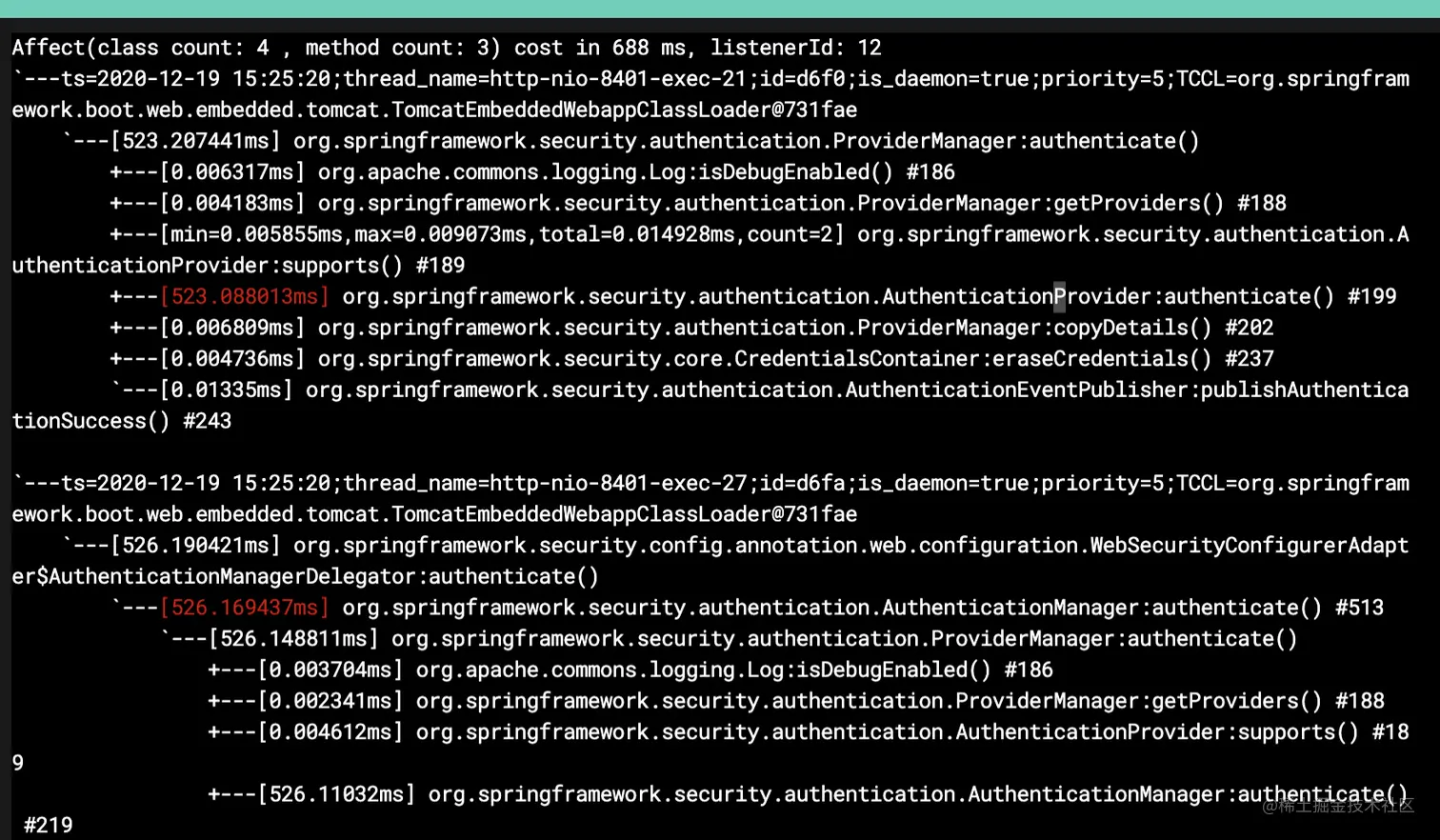 trace org.springframework.security.authentication.ProviderManager authenticate '#cost > 500' -n 3