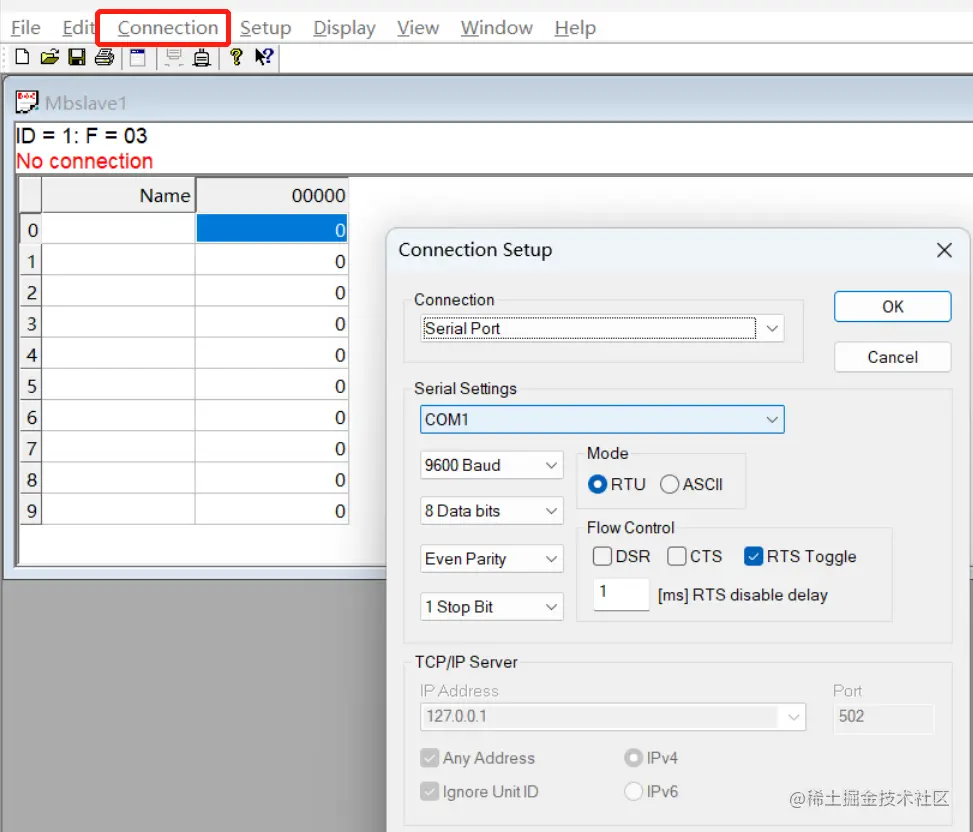 - 最终,打开 Modbus poll ,监听1号设备,创建连接。