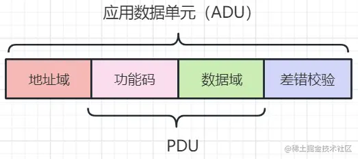ADU(Application Data Unit)应用数据单元,分四个部分:地址域、功能码、数据、差错校验(CRC、LRC)。基本上进行传输的数据都要满足这个格式,作为一个完整的帧。