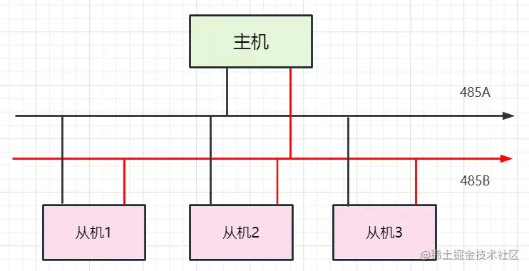 Modbus 是一主多从的通信协议,以 RS485 总线为例,大概长下面这样(先不管RS485 是啥)。