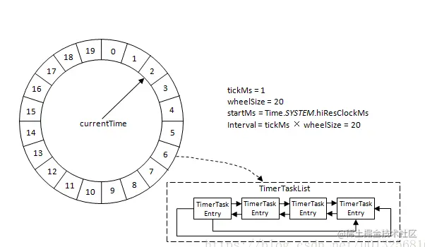 根据上面这两个属性,我们就可以讲整个时间轮的总体时间跨度(interval)可以通过公式tickMs × wheelSize计算得出。例如果时间轮的tickMs=1ms,wheelSize=20,那么可以计算得出interval为20ms。