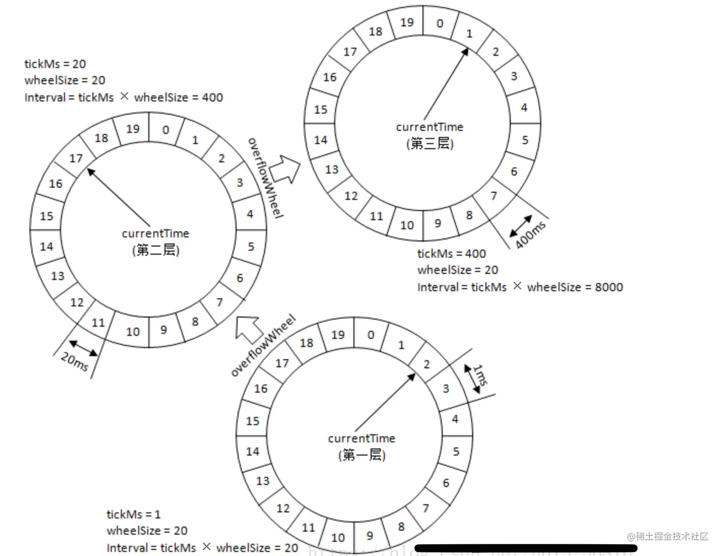 第一层和第二层时间轮的wheelSize是固定的,都是20,那么第二层的时间轮的总体时间跨度interval为400ms。正好是第一层时间轮的20倍。以此类推,这个400ms也是第三层的tickMs的大小,第三层的时间轮的总体时间跨度为8000ms。